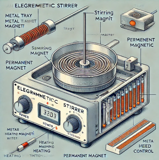 Introduce the main components of the stirrer: metal tray, stirring magnet, rotating motor, permanent magnet, heating elements (such as metal heating wire and mica insulation), control panel (power switch, heating switch, speed adjustment knob, indicator light).