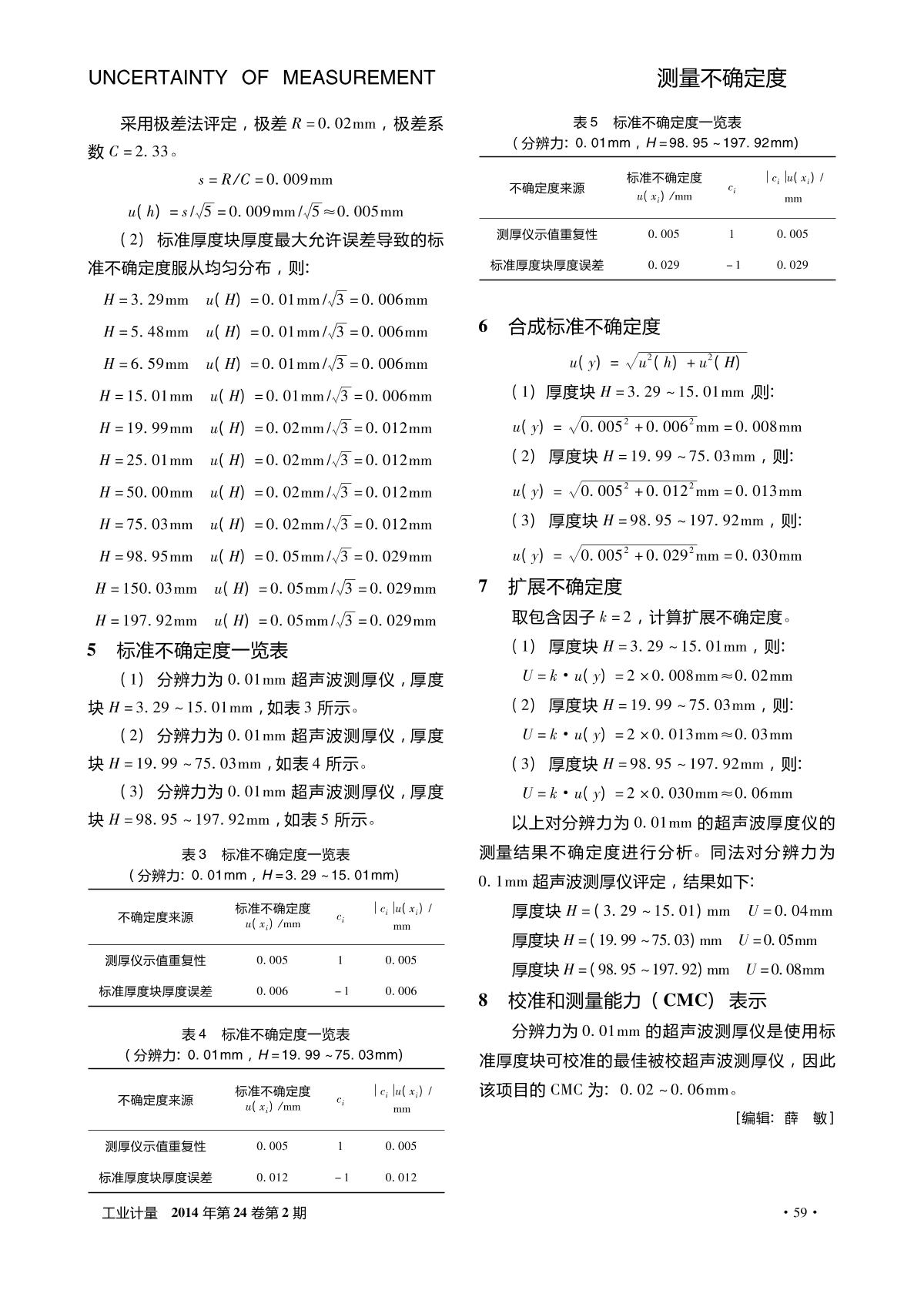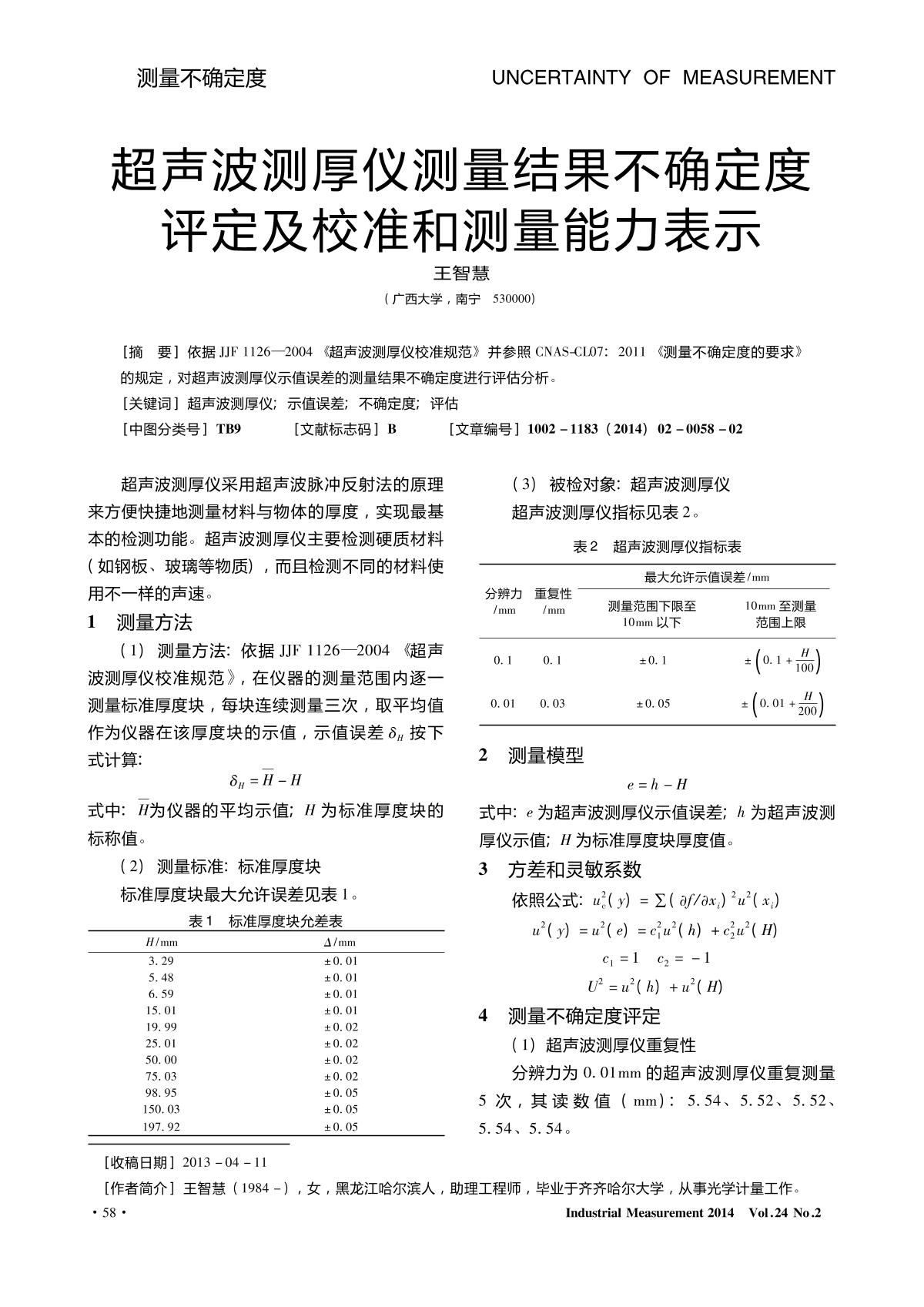 超声波测厚仪测量结果不确定度评定及校准和测量能力表示
