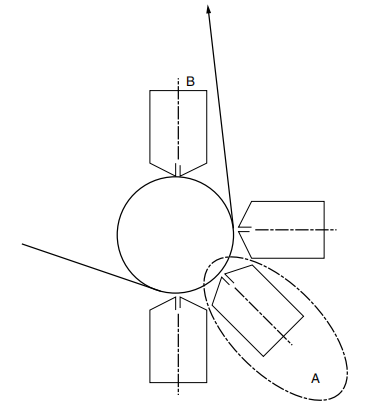 Application and utilization of existing equipment designs will determine better die-to-roll placement. Operator convenience and the ability to see the placement point are very important. We consider installation position A in Figure 20.9 to be very favorable, while position B is very unfavorable.
