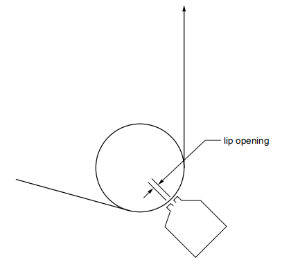 As a rule of thumb, we recommend a gap equal to the thickness of the substrate between the substrate and the feed lip. This distance may be less for very low viscosity materials or materials that are difficult to smooth. Make sure the clearance is from the web to the lip, as shown previously (Figure 20.6), and not from the roll to the lip.