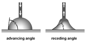 The inclined plane method gives both advancing and receding contact angles in the same droplet. Droplets are placed on the substrate and then gradually tilted. The advancing angle is measured at the front of the droplet, just before it starts moving. The receding contact angle was measured at the same time point on the back of the droplet.