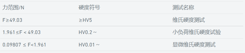 The Vickers hardness test is subdivided into three types of tests according to the test force, namely: Vickers hardness test, small load Vickers hardness test and micro Vickers hardness test. see table 1