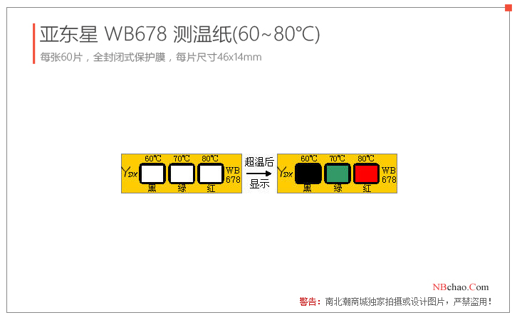 Yadongxing WB678 temperature label is a WB type temperature label with three temperature grids of 60°C, 70°C, and 80°C. It is upgraded on the basis of the WA type, and the size is increased to 1.4x4.6cm/piece. In addition, the white window of the WB678 temperature label will turn into three colors after overheating, black at 60 degrees, green at 70 degrees, and red at 80 degrees. The temperature change of the device can be monitored more clearly through the indication of the three colors. The WB678 temperature label belongs to the series of Yadongxing's window-type multi-temperature anti-fouling series. The surface is attached with a protective film, which can prevent pollution, oil and water well.