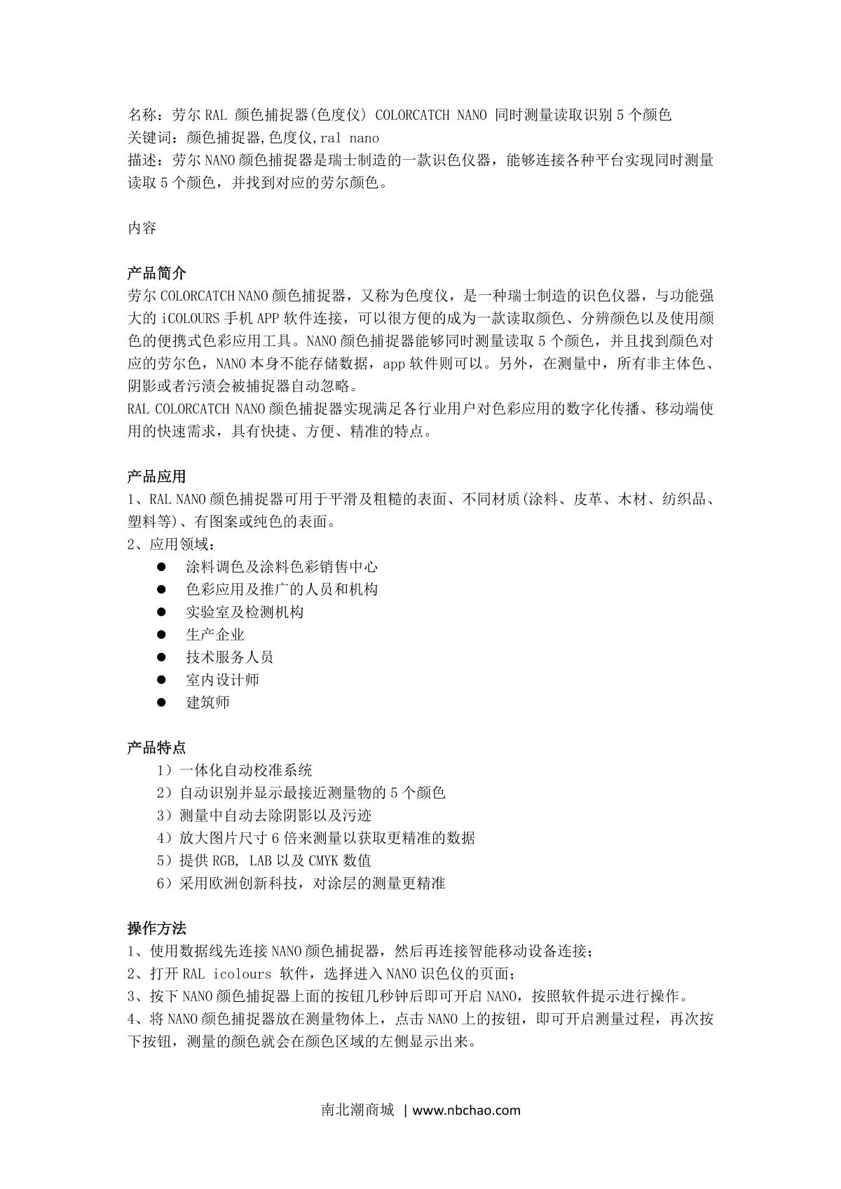 RAL COLORCATCH NANO Color Catcher (Colorimeter) Manual,OI