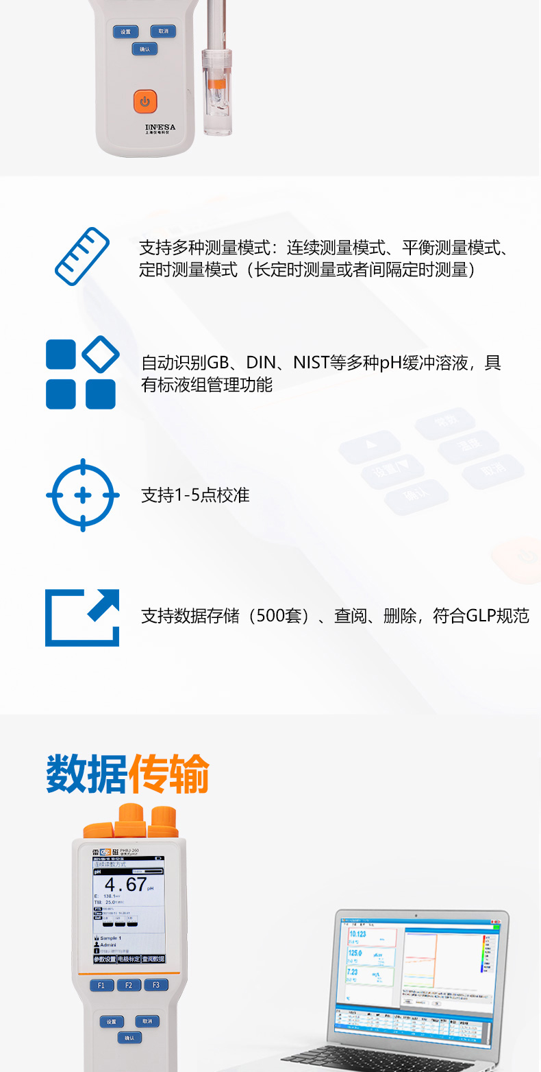 â Automatically identify three groups of standard buffer solutions such as GB, DIN, and NIST, support standard solution group management, and support customized pH buffer solutions and standard solution groups.