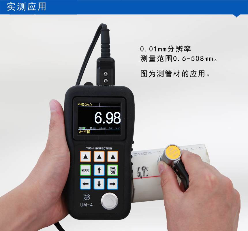 Applications: It can measure the thickness of metal materials, pipes, pressure vessels, plates (steel plates, aluminum plates), plastics, iron pipes, PVC pipes, glass and other materials; It is also widely used in manufacturing industry, metal processing industry, chemical industry, commodity inspection industry and other testing fields.