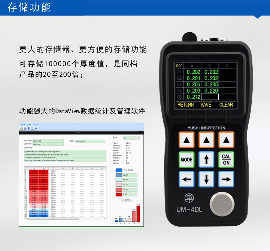 The UM-4DL Ultra High Capacity Penetrating Coating Ultrasonic Thickness Gauge is a storage type that includes all the features of the UM-4D, with the added memory function to store 10W thickness values.