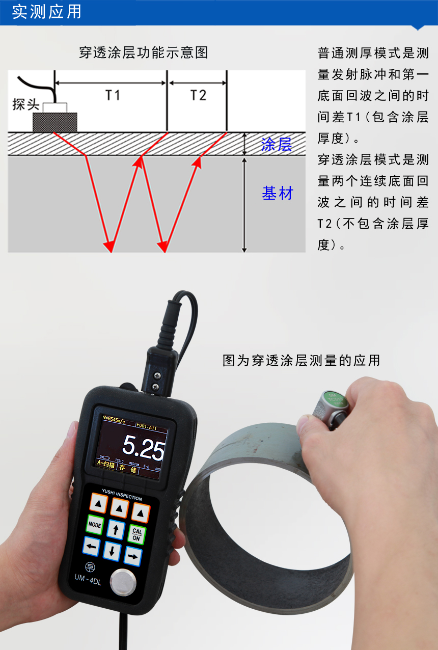 It can measure the thickness of metal materials, pipes, pressure vessels, plates (steel plates, aluminum plates), plastics, iron pipes, PVC pipes, glass and other special materials; It is also possible to measure coated materials such as paint layers on the surface of the workpiece; It is also widely used in manufacturing industry, metal processing industry, chemical industry, commodity inspection industry and other testing fields.