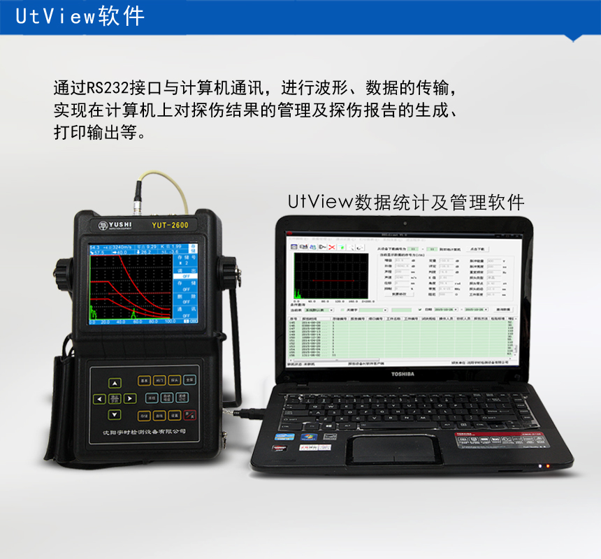 Data communication: communicate with the computer through RS232 interface, transmit waveforms and data, and realize the management of flaw detection results and the generation and printout of flaw detection reports on the computer