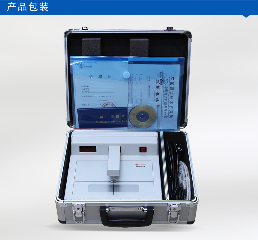 Packing list:Host × 1, Standard density sheet × 1, Power cord × 1, Encasement box × 1, Instruction manual × 1, calibrated software × 1