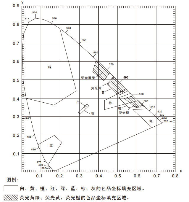 In the "GB 2893 Safety Color", "GB/T 18833 Road Traffic Reflective Film" and other related standards, a color area (multiple color coordinate points) and brightness factor requirements are usually given, and under the conditions of D65/A light source and 45/0 geometry, determine whether the sample falls in the corresponding color area, so as to determine whether the sample meets the color requirements specified in the standard. Since the color area is polygonal, as shown in the figure below, it is not possible to make a judgment with a conventional Spectrophotometer . The NS808 Colorimeter can easily solve this problem with the traffic sign measurement module of SQCT software.