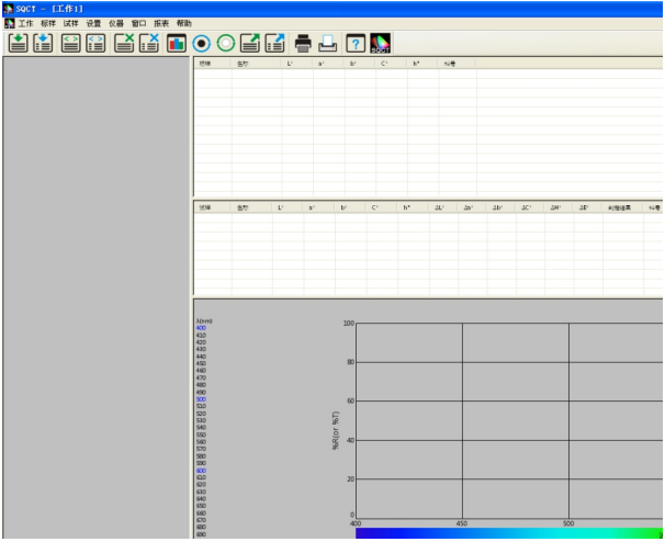The traffic sign test module of NS808 is mainly realized by the host computer software SQCT with NS808 instrument. Before use, you need to install the SQCT host computer software, and then connect the NS808 instrument, and then open the host computer software, the default is the ordinary test interface, as shown in Figure 1, under the interface, you can complete the test of CIE L*a*b, XYZ, ΔE*ab, ΔE*cmc, ΔE*00 and other chromaticity data, please refer to the introduction of the detailed menu and toolbar, please refer to the software comes with the "color management control software manual", here focuses on the traffic sign test module.