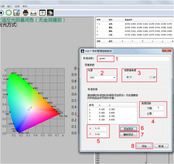 As shown in Figure 5, enter the name of the standard sample at position 1, select the light source type (D65 by default) at position 2, select the observer angle at position 3 (2 degrees by default), and enter the luminance factor at position 4 (except for fluorescent substances, the luminance factor of ordinary reflective samples is greater than 0 and less than 1, that is, 0<β). <1). Enter the color coordinate point at position 5, and then click the "Add Vertices" button, then the newly entered color coordinate point will appear in the standard color gamut box, repeat the above steps, enter each color coordinate point in turn, for the color coordinate point that is entered incorrectly, first select it in the standard color gamut box, and then click the "Delete Vertices" button, then delete the vertex. After all the inputs are completed, click the "Add" button at position 8 to complete the establishment of "Polygon-Tolerance Standard".