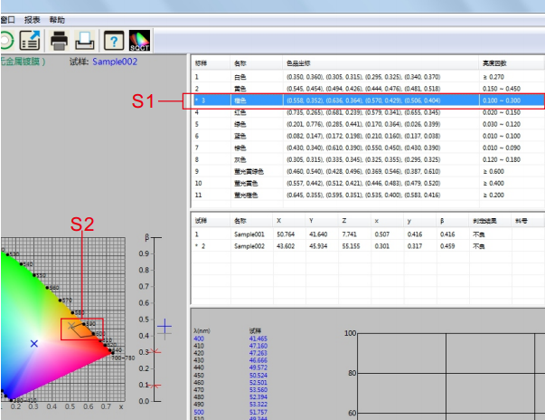 Assuming that we need the orange (daytime color) in the non-metallic coating type in the standard GB/T 18833 as the polygon-tolerance standard (corresponding to the sixth line of Table 8 in the standard GB/T 18833), we only need to click "standard-> road traffic reflective film GB/T 18833->daytime color" in turn, as shown in Figures 8 and 9, the S1 area shows the corresponding color coordinate points of orange, and the S2 area shows the corresponding polygon-tolerance standard.