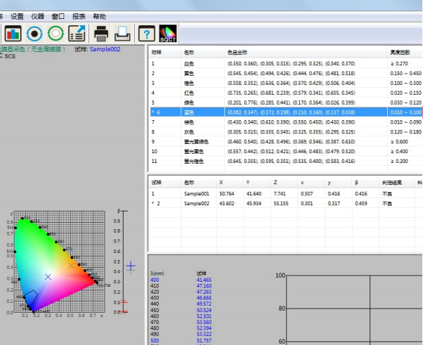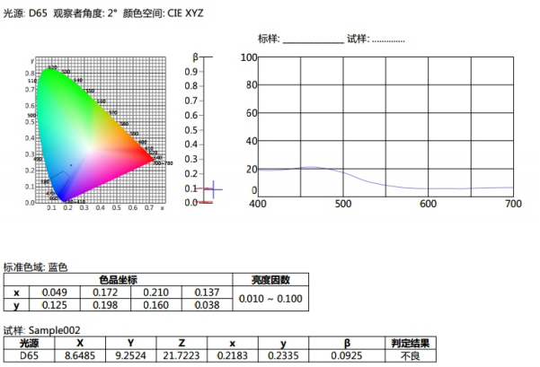 For example, how to determine whether the blue sample is in the blue area specified in the "GB/T 18833-2012 Road Traffic Reflective Film Sample" (no metal plating, daytime reflective film color), according to the following steps, the measurement and judgment will be completed in turn.