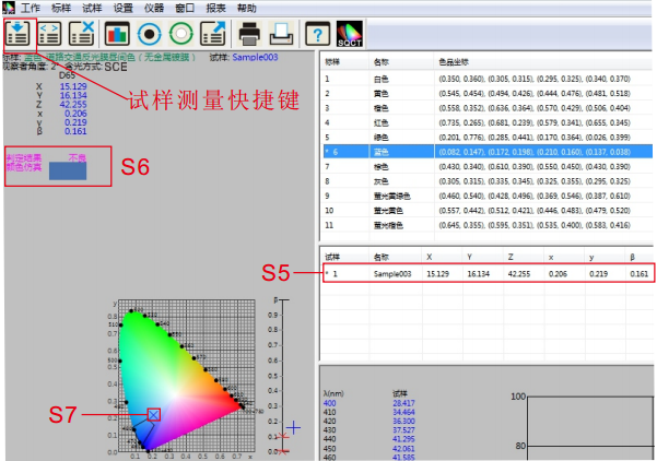Place the test sample on the NS808 measuring aperture, attach it tightly, and click the mouse on the shortcut tool for specimen testing, as shown in Figure 13. The test is completed in about 1.5 seconds, and the test data is shown in S5 in Figure 13, the position in the color product seat is shown in S7, and the simulation and judgment results are shown in S6.