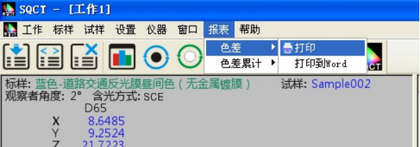 The test results of the sample can be generated through the print menu, select the sample and standard sample to be printed, and execute "Report-> Color Difference-> Print/Print to Word" or "Report->Color Difference Accumulation-> Print/Print to Word" to print out the test results, as shown in Figures 15 and 16.