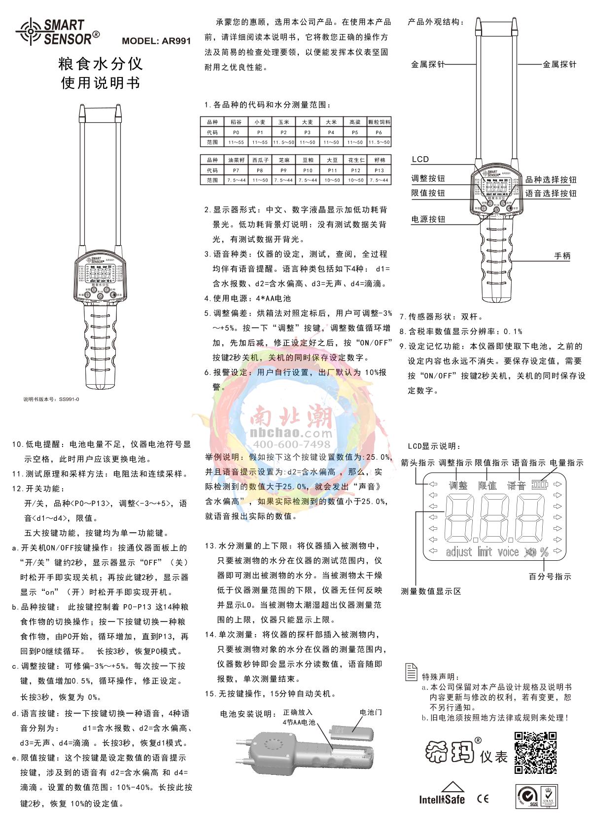 SMART SENSOR AR991 Moisture Tester Manual,OI