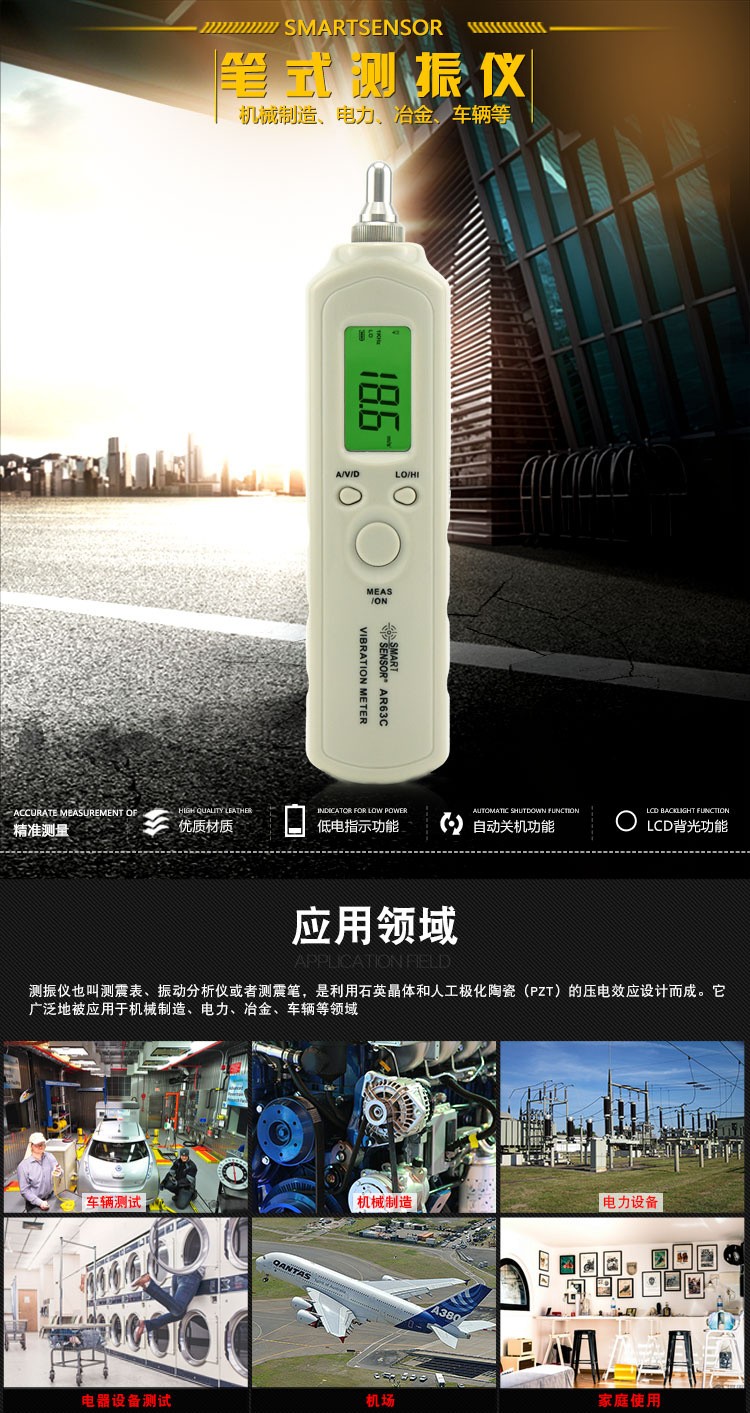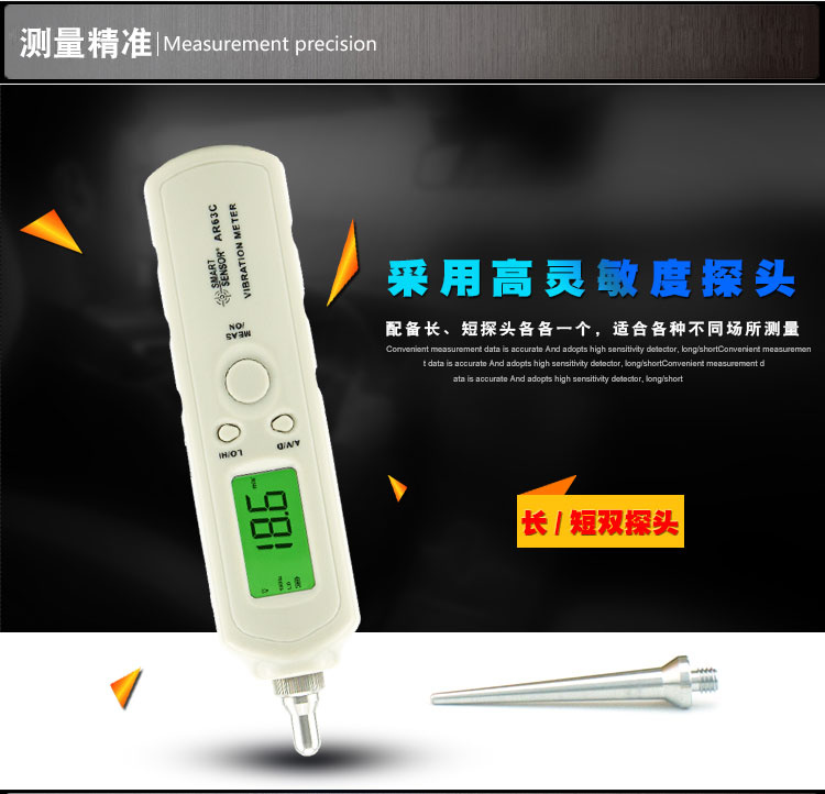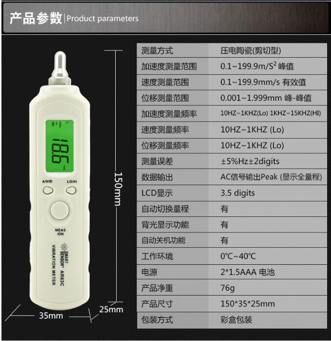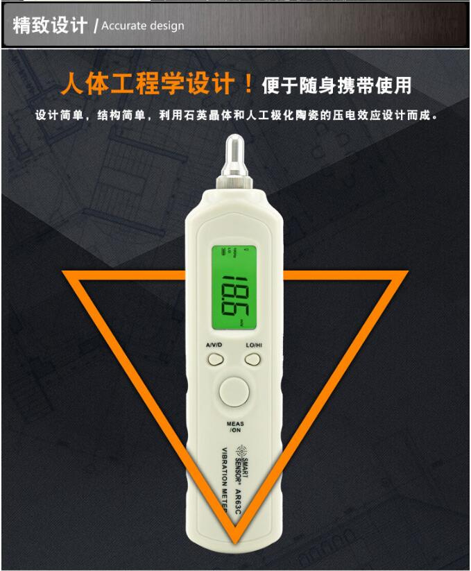 SIMA AR63C Vibration Meter is also called Vibration Meter Vibration Analyzer or Vibration Pen. It is designed by using the piezoelectric effect of quartz crystal and artificially polarized ceramic (PZT). It is widely used in machinery manufacturing, electric power, metallurgical vehicles and other fields.