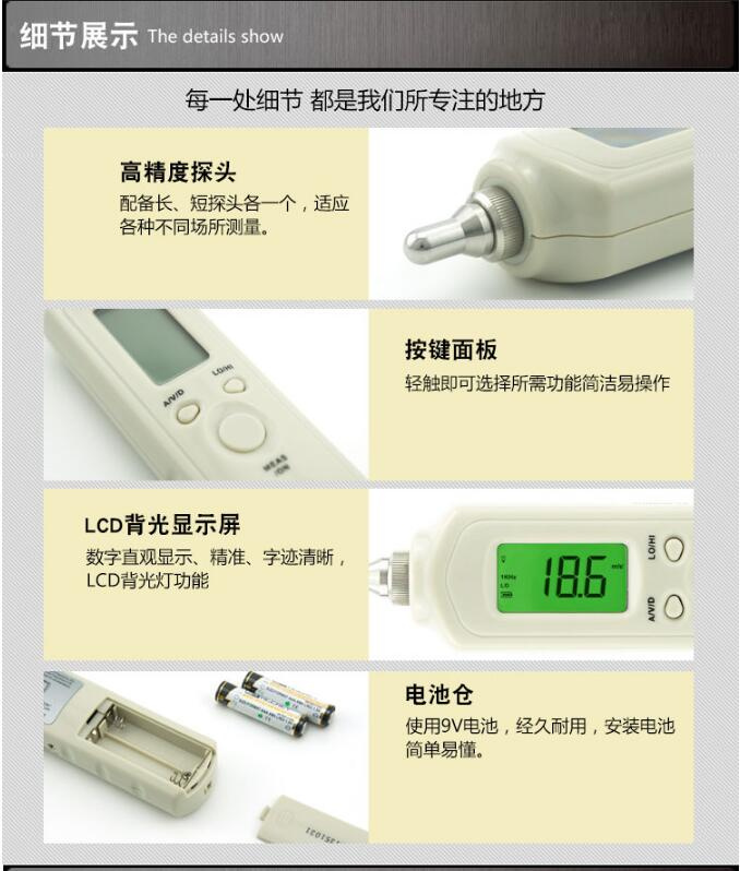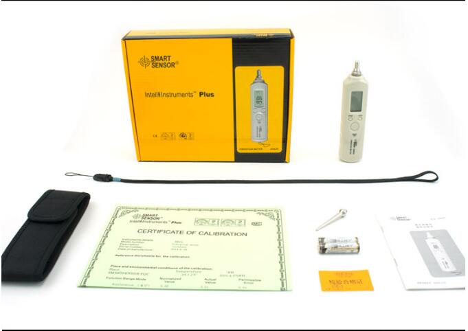 Packing list:Vibration meter X1, original battery X2, long probe x1, short probe x1, factory certificate X1, warranty card X1, manual X1, leather case x1