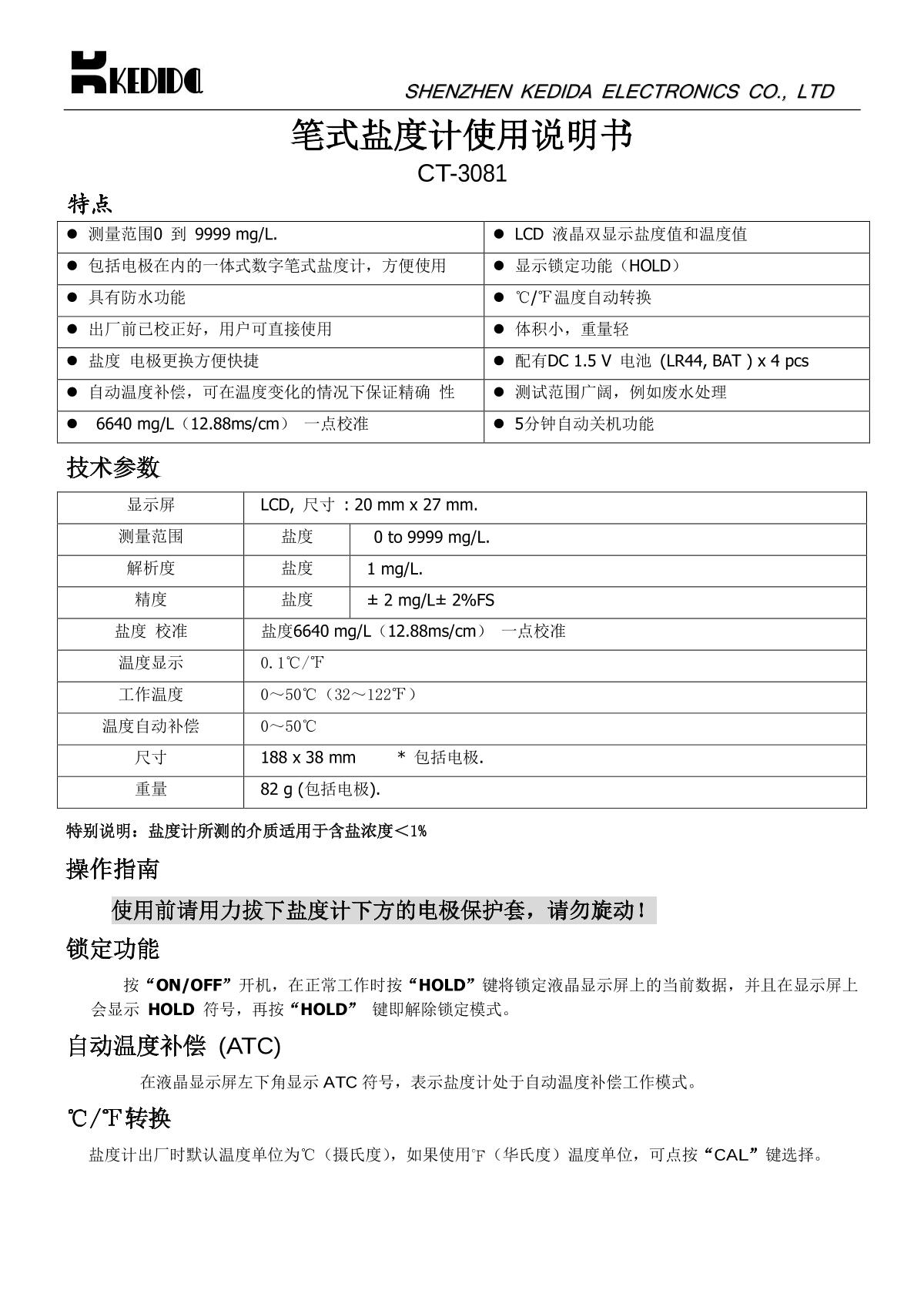 KeDiDa CT-3088 Pen Salinometer Built-in electrode Range: 0.0~10.0%LCD20 mm x 27 mm0.0%~10.0%¥540.0SE