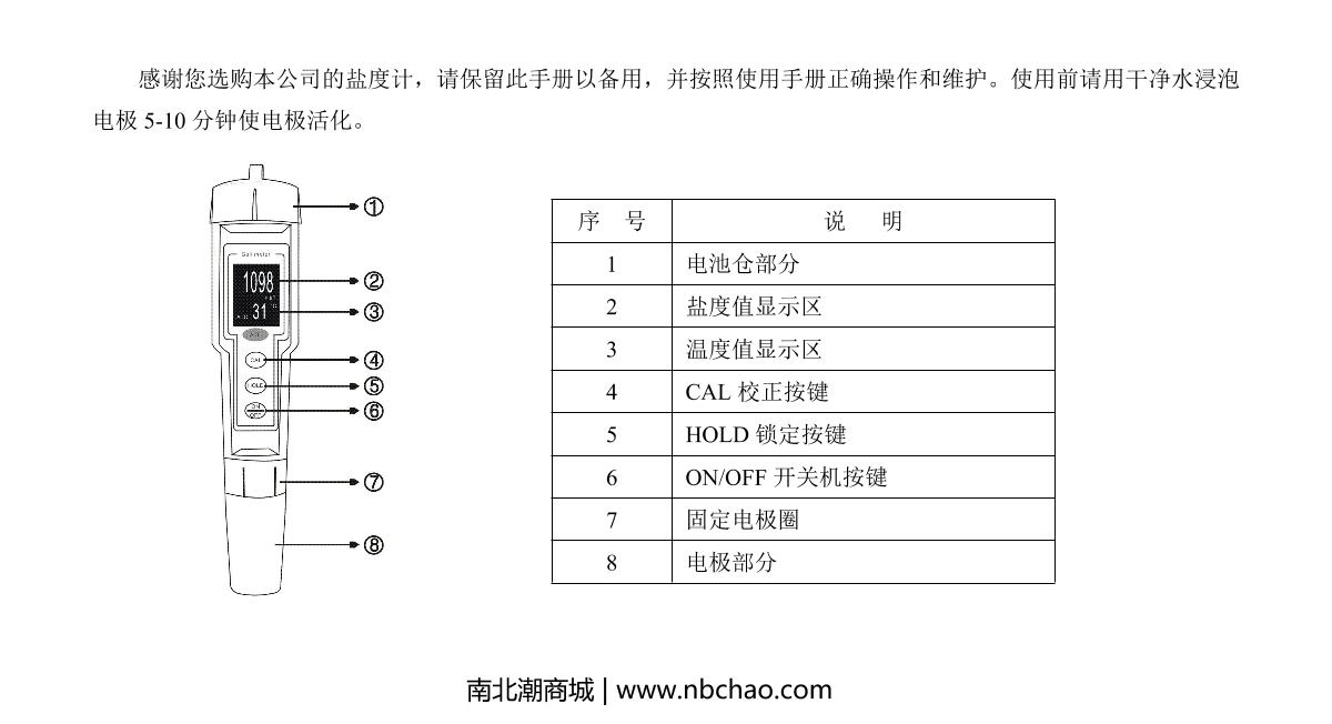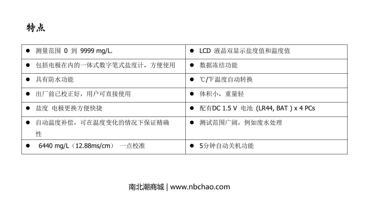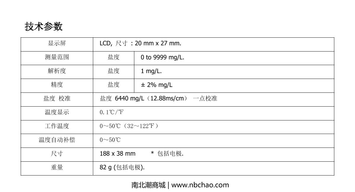 KeDiDa CT-3088 Pen Salinometer Built-in electrode Range: 0.0~10.0%LCD20 mm x 27 mm0.0%~10.0%¥540.0SE -
