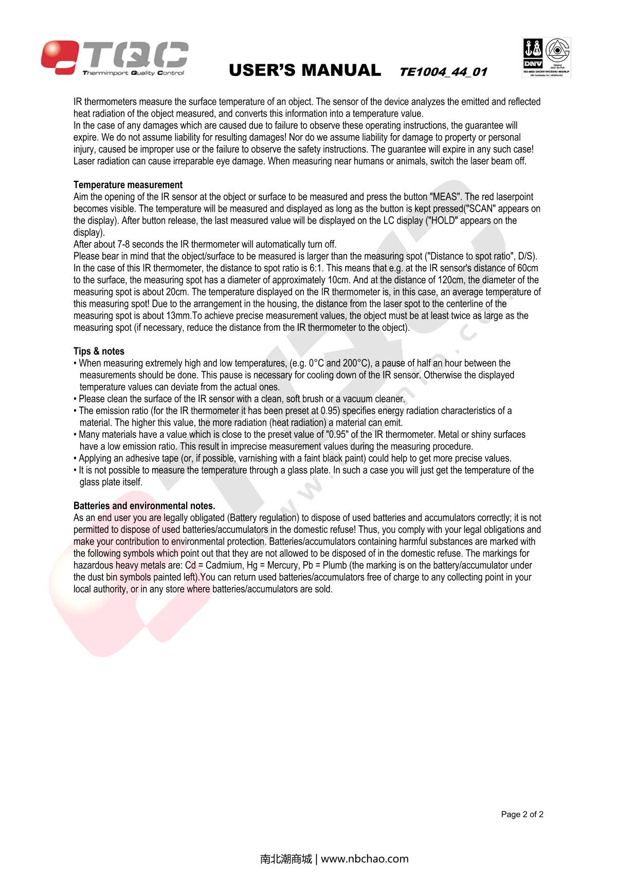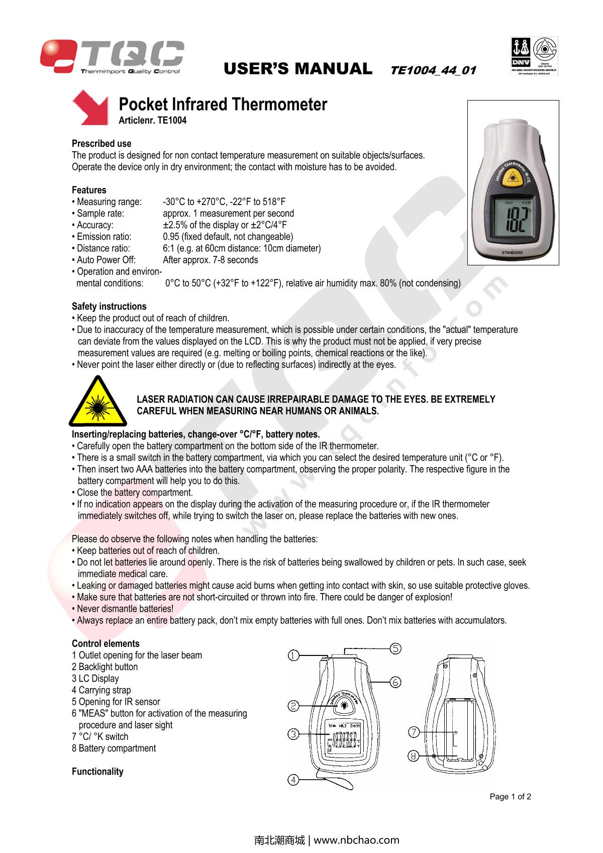 TQC sheen TE1004 Infrared Thermometer Manual,OI