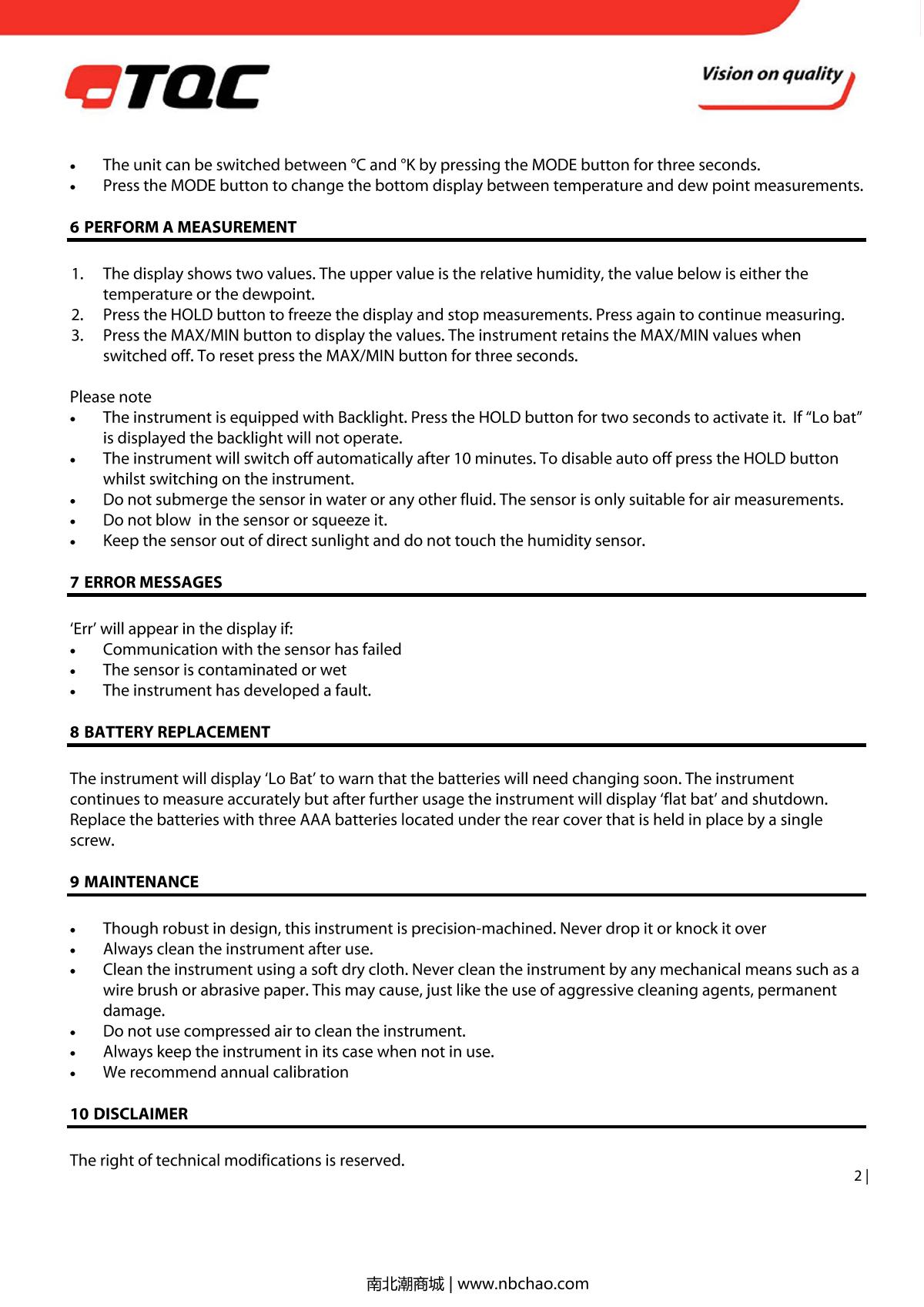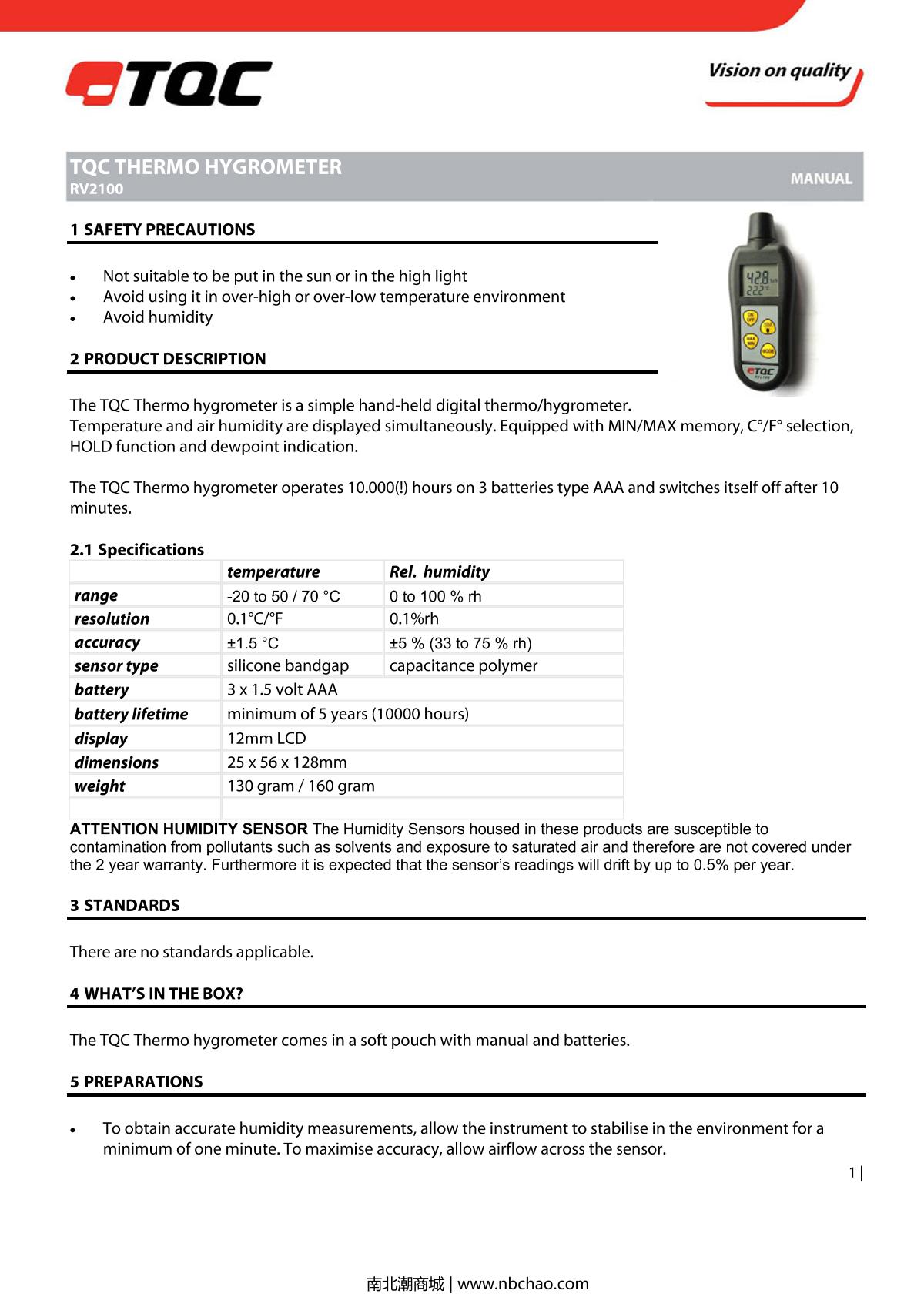 TQC sheen RV2100 Thermohygrometer Manual,OI