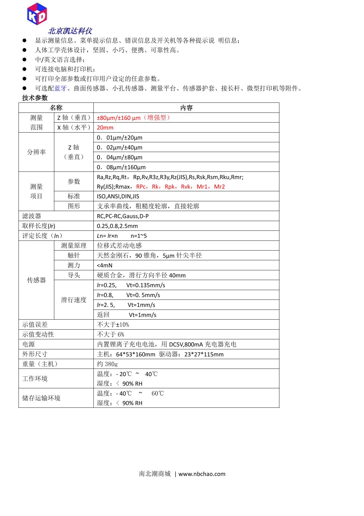 KAIRDA NDT160 Roughness Gauge split surface roughness Testerdigital displayRa,Rz,Rq,Rt,Rp,Rv,R3z,R3y,Rz(JIS),Rs,Rsk,Rsm,Rku,Rmr; Ry(JIS);Rmax,RPc,Rk,Rpk,Rvk,Mr1,Mr2Z-axis (vertical): ± 80μm/± 160µm (enhanced); X-axis (horizontal): 20mmSE -