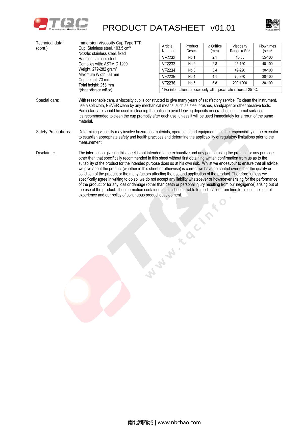 - 3TQC sheen VF2091 Immersion Viscosity Cup Manual