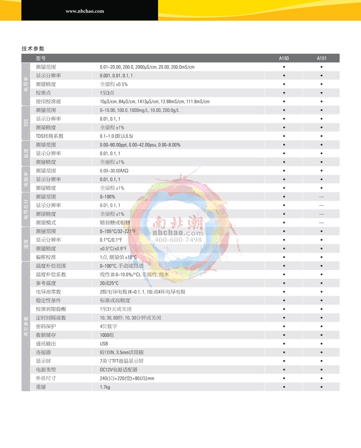 BANTE A151-DL Laboratory conductivity /TDS/salinity/resistivity meter0.05µS/cm~20mS/cm0.001, 0.01, 0.1, 1±0.5% F.S¥3510.0SE -
