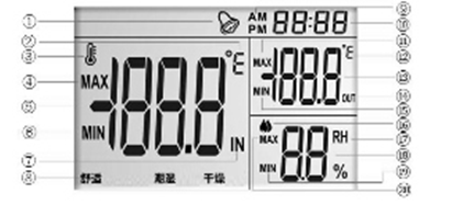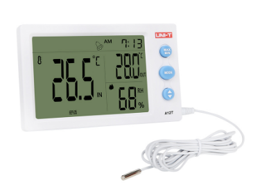 A12T digital temperature and humidity meter can display indoor temperature/humidity in real time, comfort level prompt, outdoor temperature, maximum/minimum temperature and humidity memory function, clock function, can be converted to 12/24 hour clock, alarm clock function, alarm clock time up to 60s.
