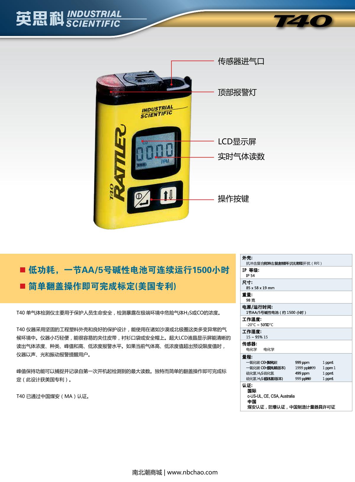 INDUSTRIAL SCIENTIFIC T40-H2S(0-500PPM) Gas Detector brochure