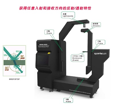 The BBMS-2000 bidirectional reflection/transmission spatial distribution measurement system can measure the scattering characteristics of the material surface, including the material's transmission distribution BTDF/reflected light distribution BRDF, total reflection TIR/scattering TIS and color parameters. It is widely used in plastics, auto parts, and furniture. , textile, glass and many other fields, it can characterize the properties of the apparent color appearance of materials that change with angle, as well as appearance characterization such as material surface modification.