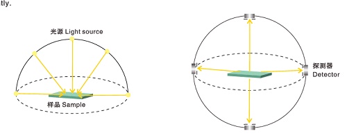 1) The system rotates through four axes (A-axis, B-axis, C-axis, D-axis), which can realize the measurement of the Detector around the entire spherical surface of the tested sample, and the illumination of the light source around the half-spherical surface of the tested sample, automatically and Quickly realize the illumination and reflectance/transmittance measurement of the entire space of the sample being tested.
