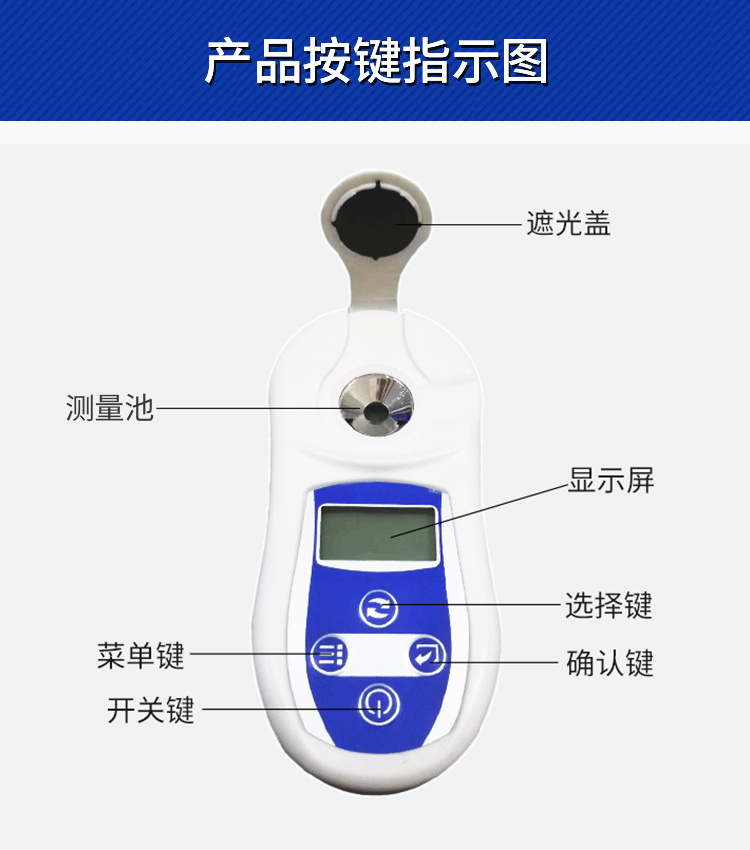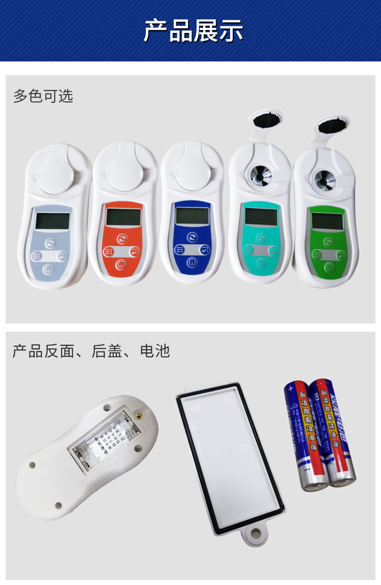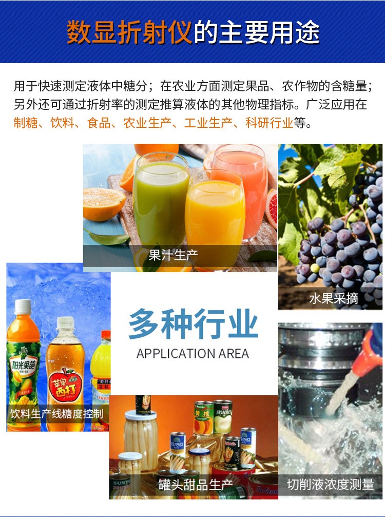 The sugar meter is used to quickly determine the concentration or refractive index of sugar-containing solutions and other non-sugar solutions. Widely used in sugar, food, beverage and other industrial sectors as well as agricultural production and scientific research. It is suitable for the concentration measurement of various sauce (seasoning) products such as soy sauce, tomato sauce, and the sugar content measurement of jam, syrup, liquid sugar and other products containing a lot of sugar. It is suitable for the production line of fruit juice, refreshing drinks and carbonated drinks , quality management, pre-delivery inspection, etc. It is suitable for the process of fruit from planting to sales. It can be used to determine the exact harvest time and classify the sweetness.