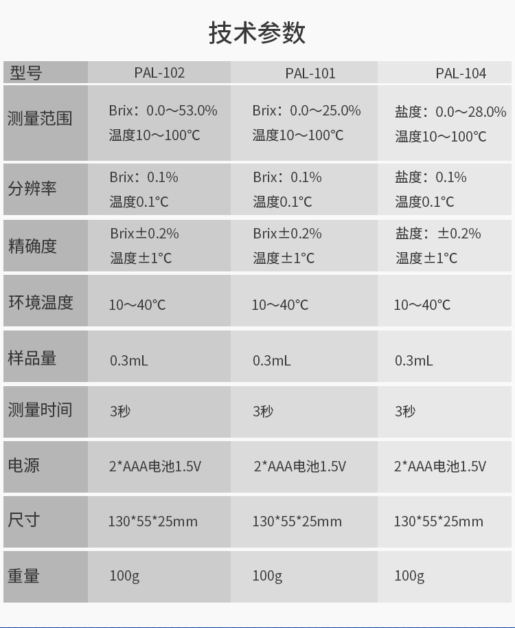 Qiwei PAL-102 digital sugar meter adopts a blue shell, the measurement sugar content range is 0.0~53.0%, and the measurement temperature range of PAL-102 digital sugar meter is 10~100 ℃, suitable for fruit juice, refreshing beverages and carbonated drinks and other industries.