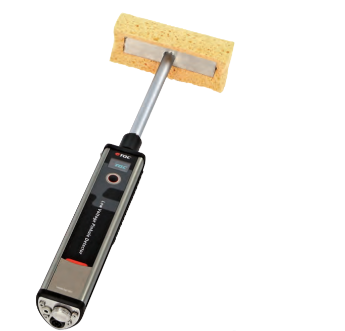 The TQC Low Voltage Pinhole Detector consists of a battery-powered instrument and ground leads, as well as wet sponge electrodes. The ground leads are connected to the bare substrate. The movement of the moistened sponge over the test area allows moisture to enter the pinhole due to capillary absorption, thus coming into contact with the base substrate that is the ground. Causes audible, visual, or tactile/vibrational alarms to indicate pinholes. The number of pinholes detected is stored in memory and remains usable even if the battery is replaced.