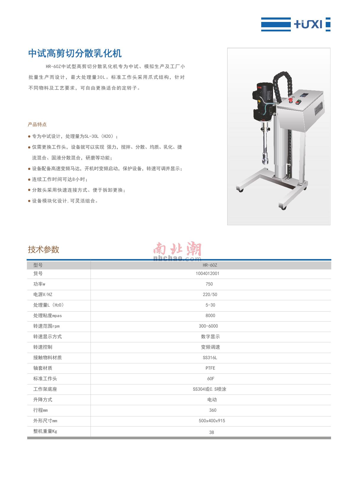 HuXi HR-60Z (electric lift) Pilot High Shear Dispersion Mulser brochure