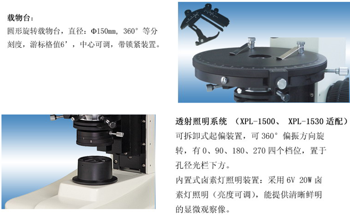 - Built-in polarizer, can freely switch between normal observation and polarization observation, 90 ° swirl/spin, with scale, vernier grid value 12 '; push-in Boehr mirror, center adjustable; λ compensator; λ/4 compensator; quartz wedge compensator;