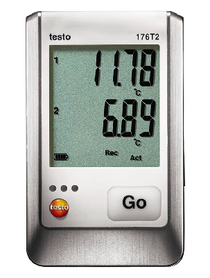 The testo 176 T2 temperature data logger is particularly suitable for two-channel temperature monitoring and can be connected to two Pt100 temperature probes at the same time. As a result, the temperature values of two different measuring points can be monitored at the same time and, if required, the temperature difference between the two measuring points can be viewed directly on the Recorder's display.