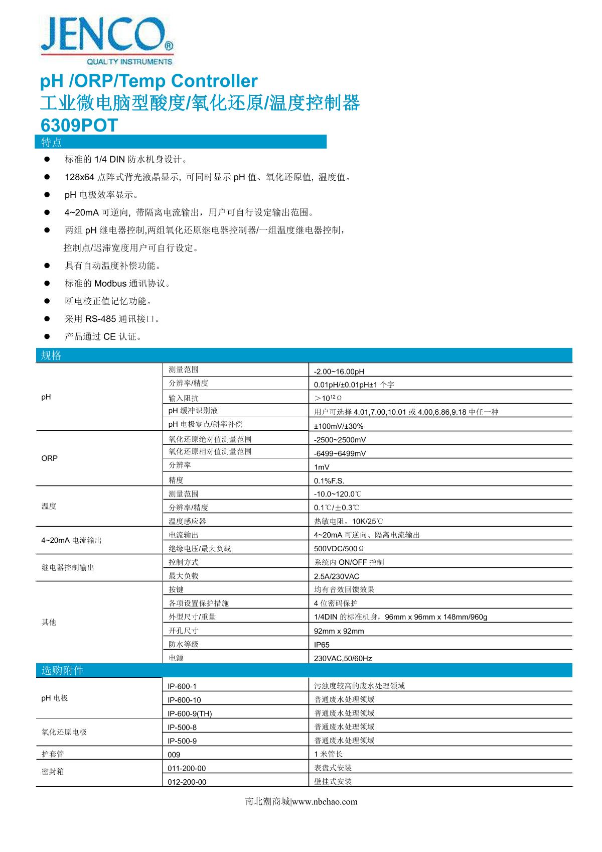 JENCO 6309POT PH/oxidation/temperature controller brochure