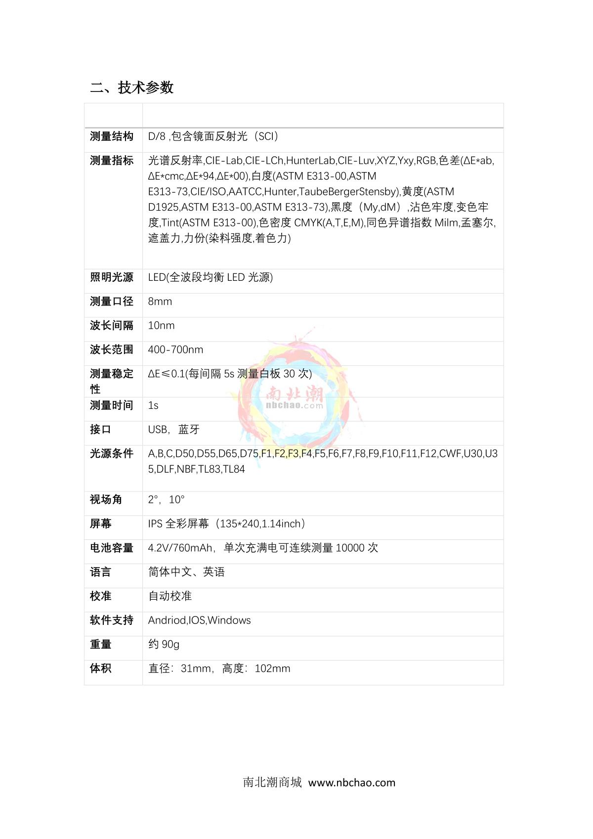 CHNSPEC CR30 Spectroscopic Color Treasure, Screen Enhanced Edition45°/0RGB, Hex, Lab, LCh, HSB, LRV, Light spectrum reflectance, HunterL ab, CIE-Luv, XYZ, Yxy, color difference (OE * ab, E * cmc, OE * 94,0E * 00)Whiteness (ASTM E313-00, ASTM E313-73, CIE/ISO, AATCC, Hunter, TaubeBerger-Stensby), Yellowness (ASTM D1925, ASTM E313-00, ASTM E313-73)¥999.0SE -