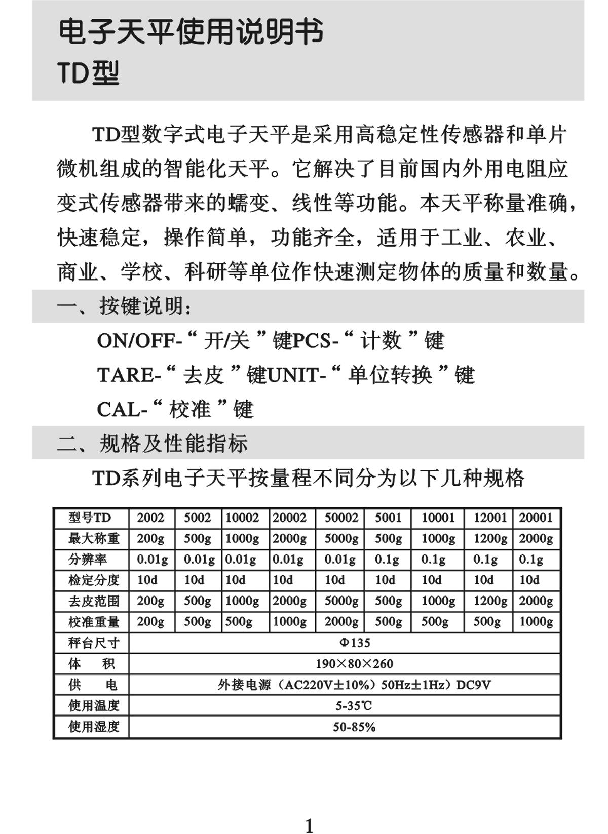 TianMa TD10001 TD Series Electronic Balance Manual,OI