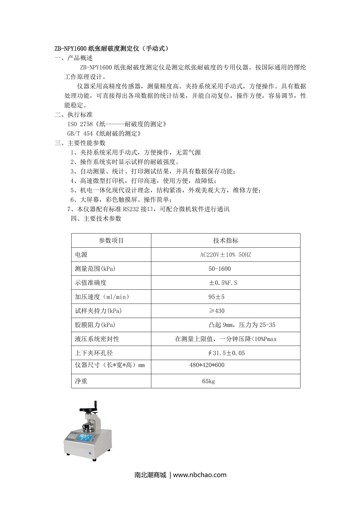 ZhiBang ZB-NPY1600 Manual paper Burst Tester brochure