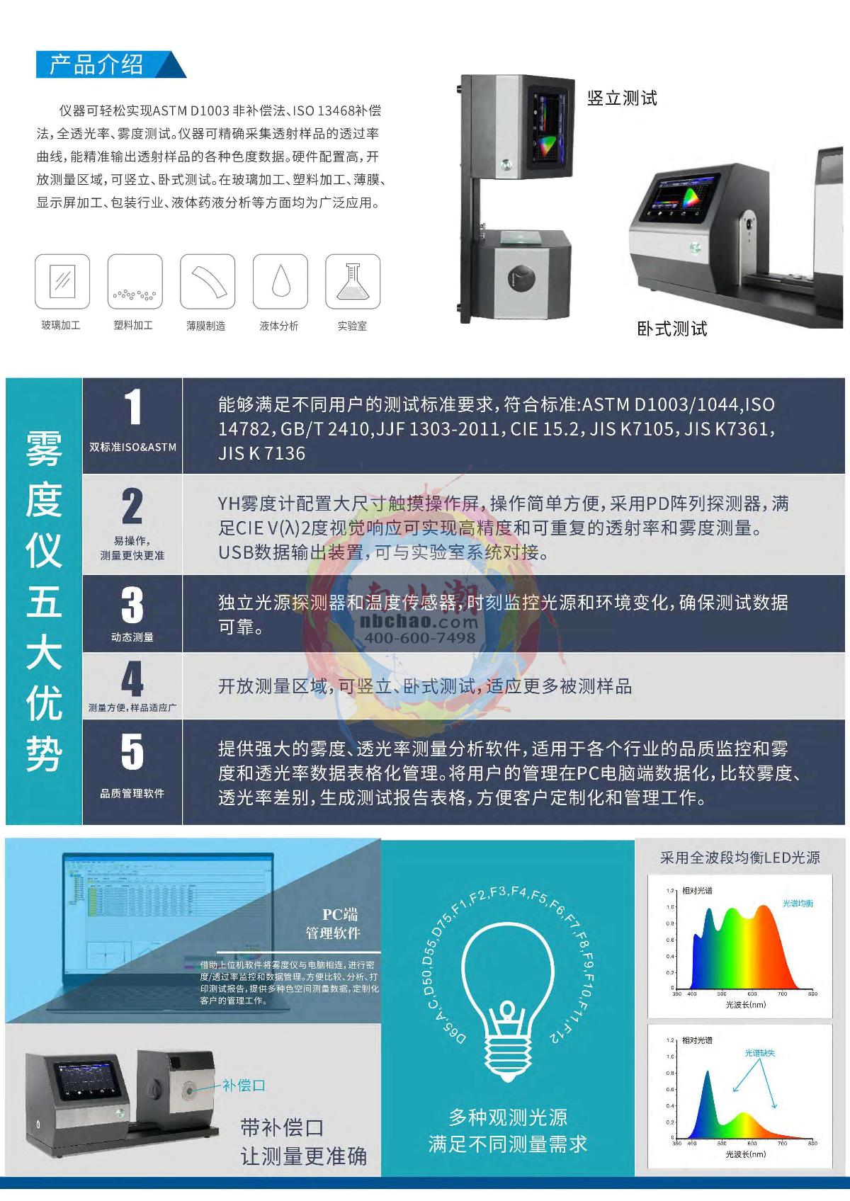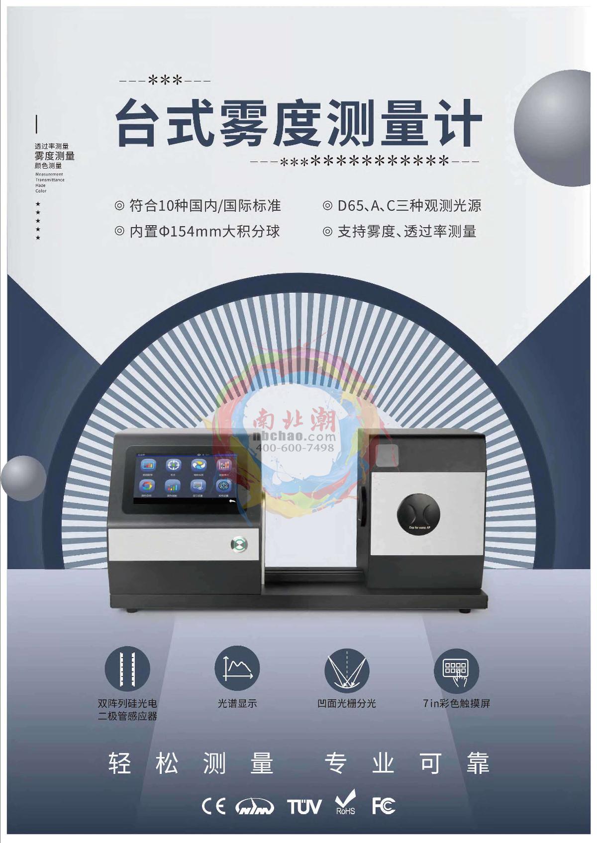3NH YH1100 Haze Meter φ 20mmTransmission: 0/D (parallel light illumination, diffuse reflection reception) Compliant with standards: ASTM D1003/1044, ISO 14782, GB/T 2410, JJF 1303-2011, CIE 15.2, JIS K7105, JIS K7361, JIS K 7136F154mm400~700Nm combined LED light sourceSE -