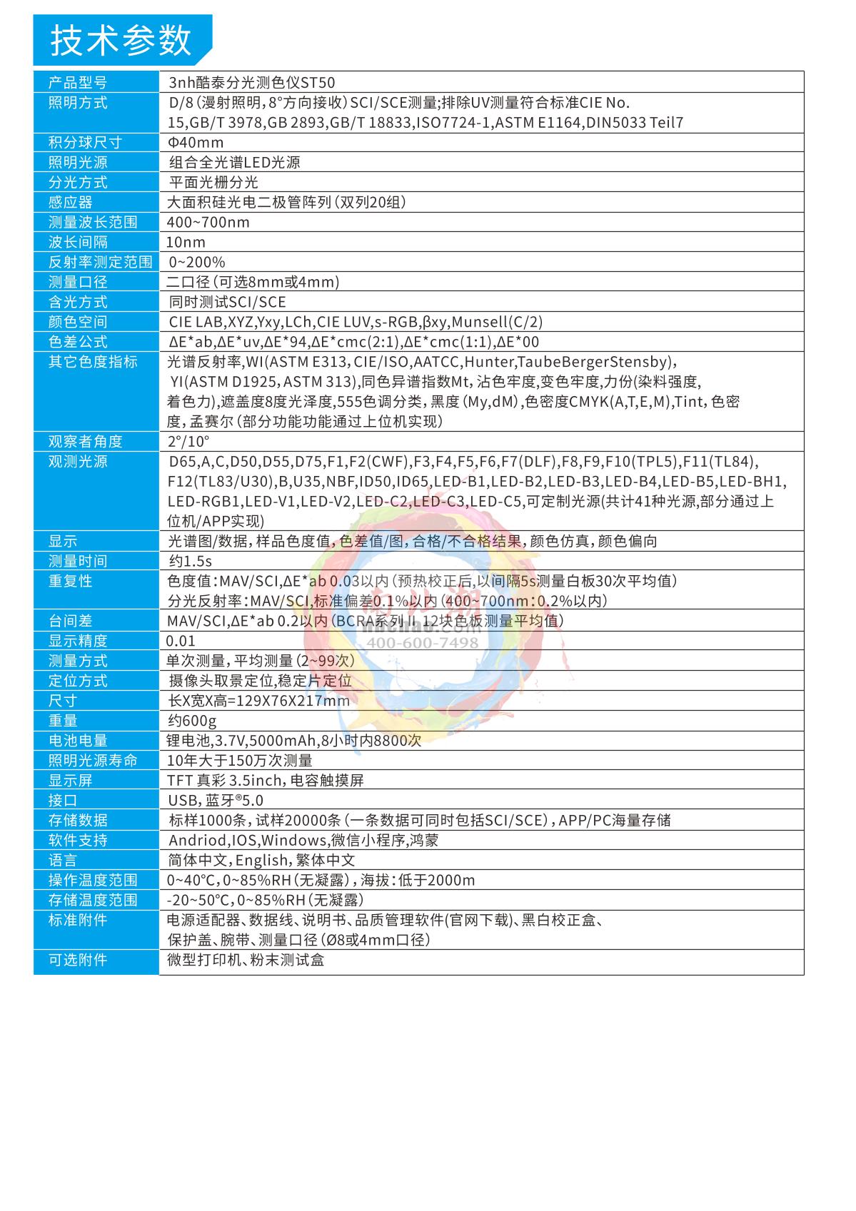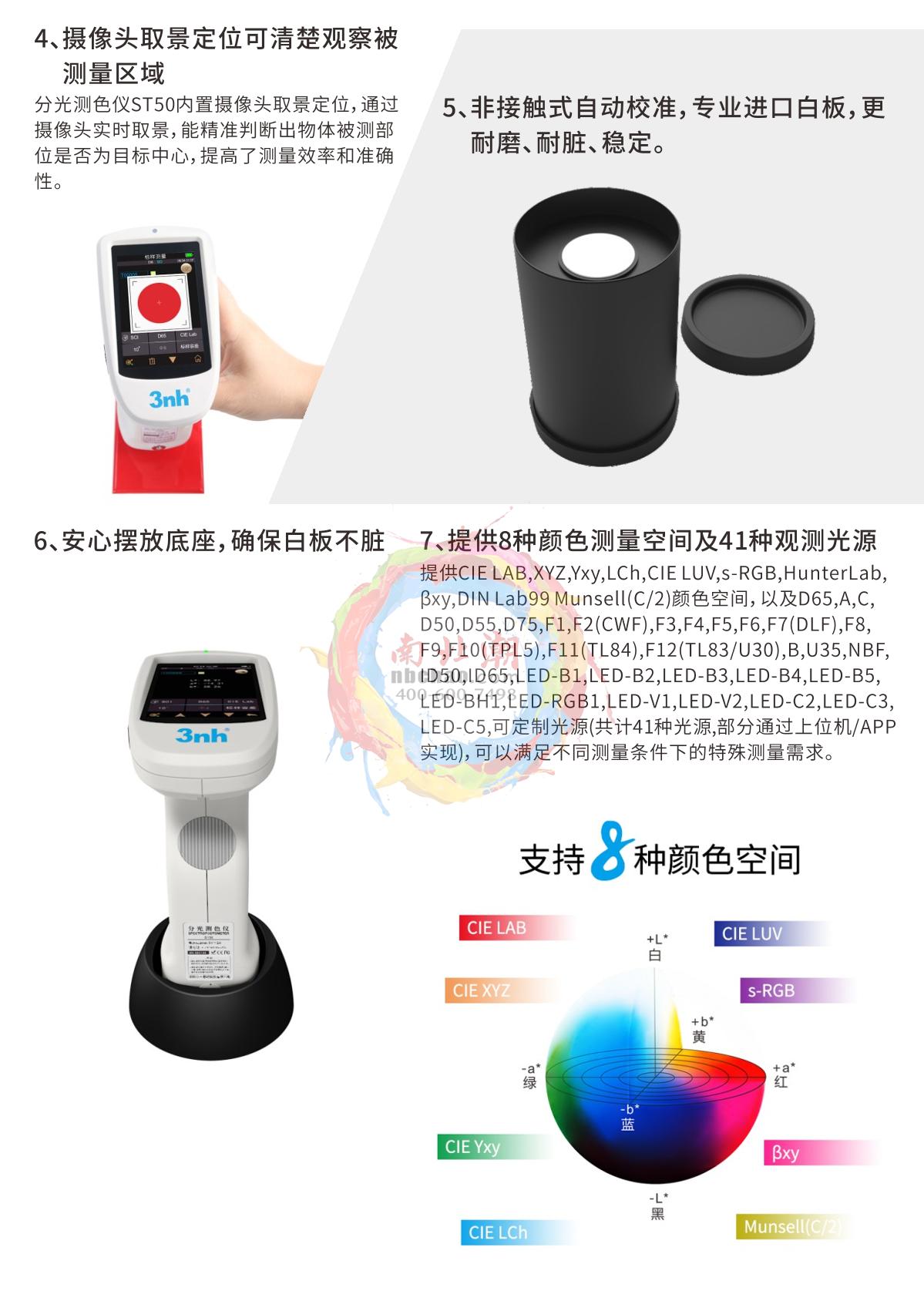 3NH TS7030 spectral Colorimeter Delta E * ab < 0.06D/8 (diffuse illumination, 8 ° direction reception) SCI/SCE measurement conforms to CIE No.15, GB/T 3978, GB 2893, GB/T 18833, ISO7724-1, ASTM E1164, DIN5033 Teil7F40mmLight spectrum LED light sourceSE