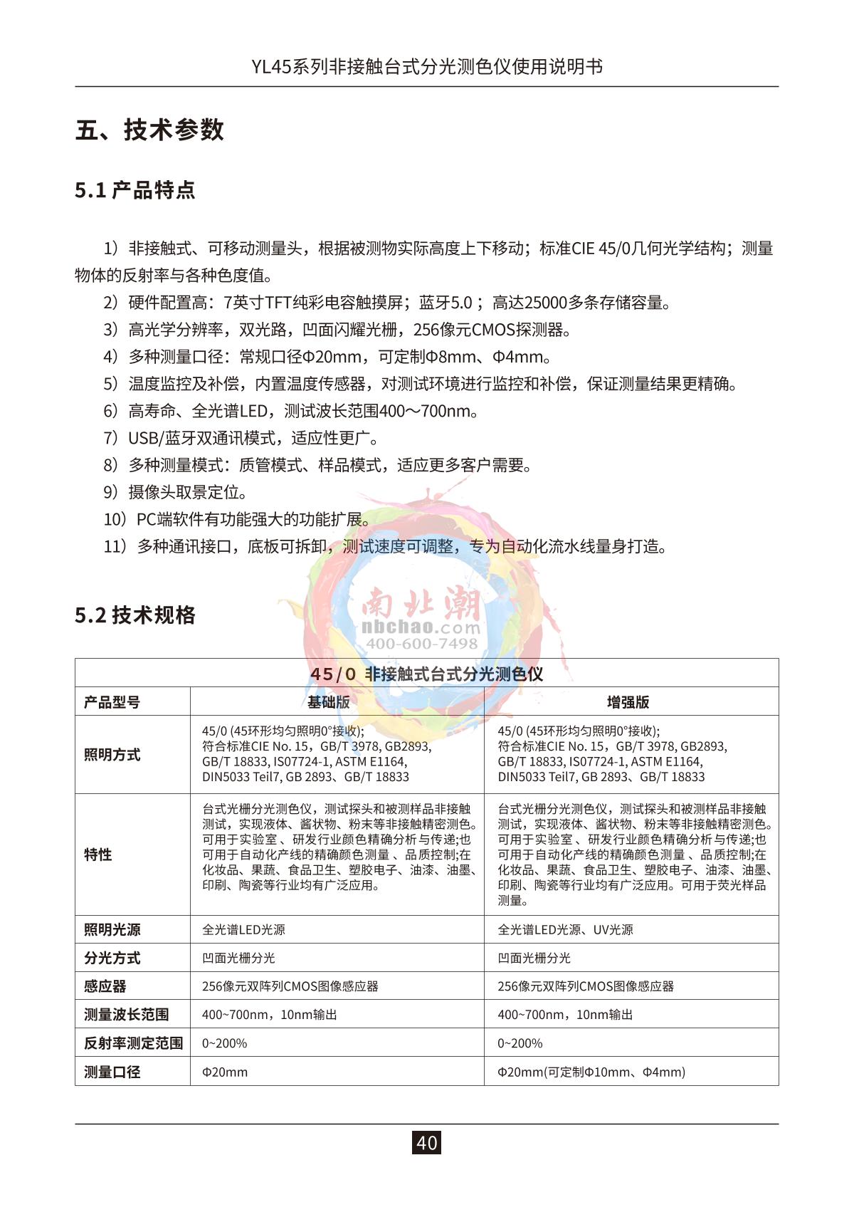 3NH YL4560 45 °/0 ° Non-contact Colorimeter Enhanced LED + UV Customizable caliber, automatic lifting45/0 (45 annular uniform illumination 0 ° reception); conforms to standard CIE No.15, GB/T 3978, GB 2893, GB/T 18833, ISO7724-1, ASTM E1164, DIN5033 Teil7, GB 2893, GB/T 18833Light spectrum LED light source, UV light sourceConcave grating spectroscopySE -