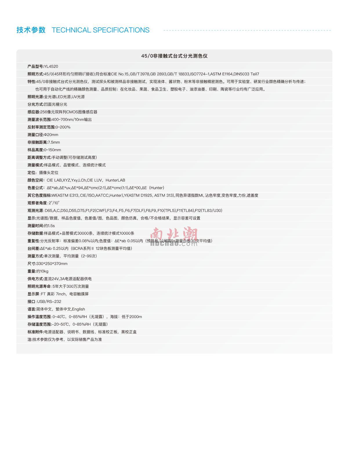 3NH YL4560 45 °/0 ° Non-Contact Colorimeter Measurable Phosphor45/0 (45 annular uniform illumination 0 ° reception); conforms to standard CIE No.15, GB/T 3978, GB 2893, GB/T 18833, ISO7724-1, ASTM E1164, DIN5033 Teil7Light spectrum LED light sourceConcave grating spectroscopySE -