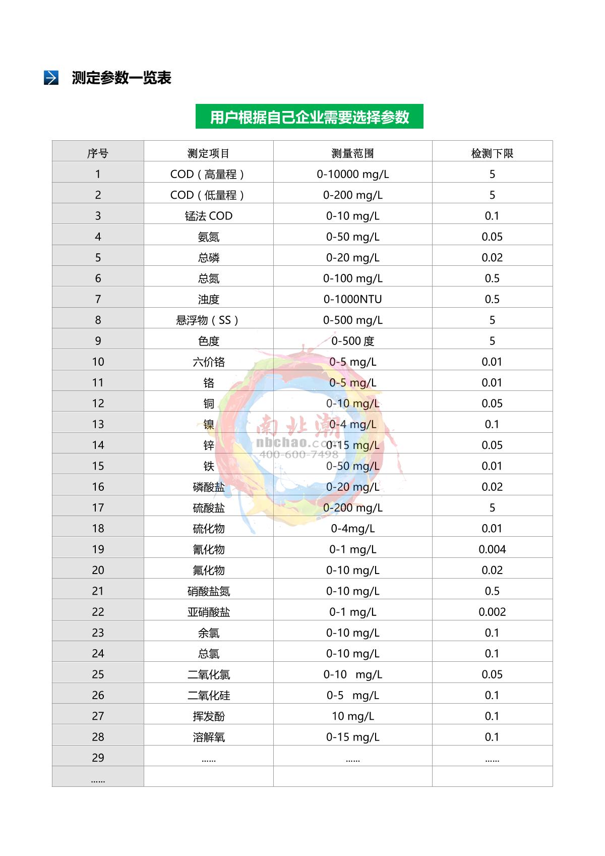TONGAO TR-4ZH Portable multiparameter water quality monitorCOD, ammonia nitrogen, total phosphorus, total nitrogen, total chromium, hexavalent chromium, copper, zinc0-15000Mg/L (segmented)1000mg/L¥28800.0SE -